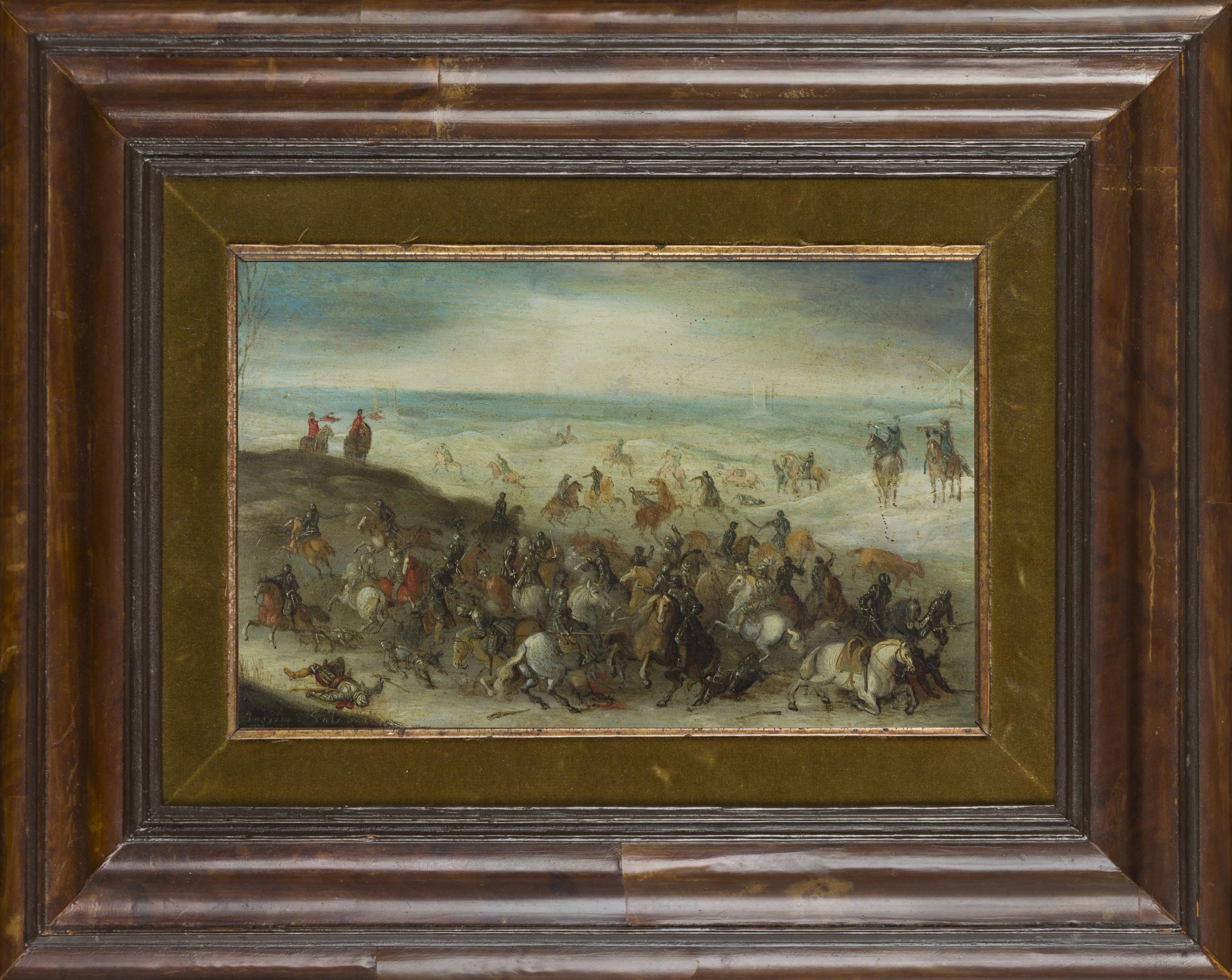 Rare reprise par un artiste religieux portugais d’une gravure tirée d’une bataille flamande. L’original est un tableau de Sebastian Vrancx conservé au Musée Groeninge de Bruges.