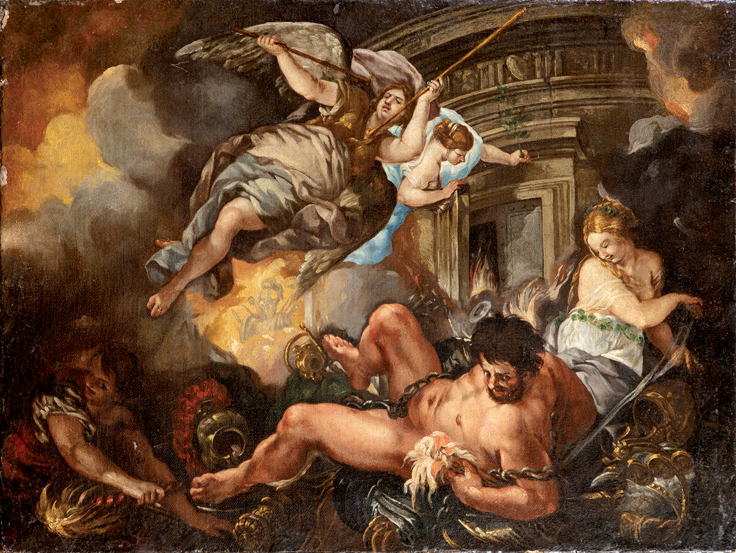 Cette composition complexe et chaotique était conçue pour être vue d’en bas, accentuant la sensation de mouvement descendant des figures tombant dans l’espace.