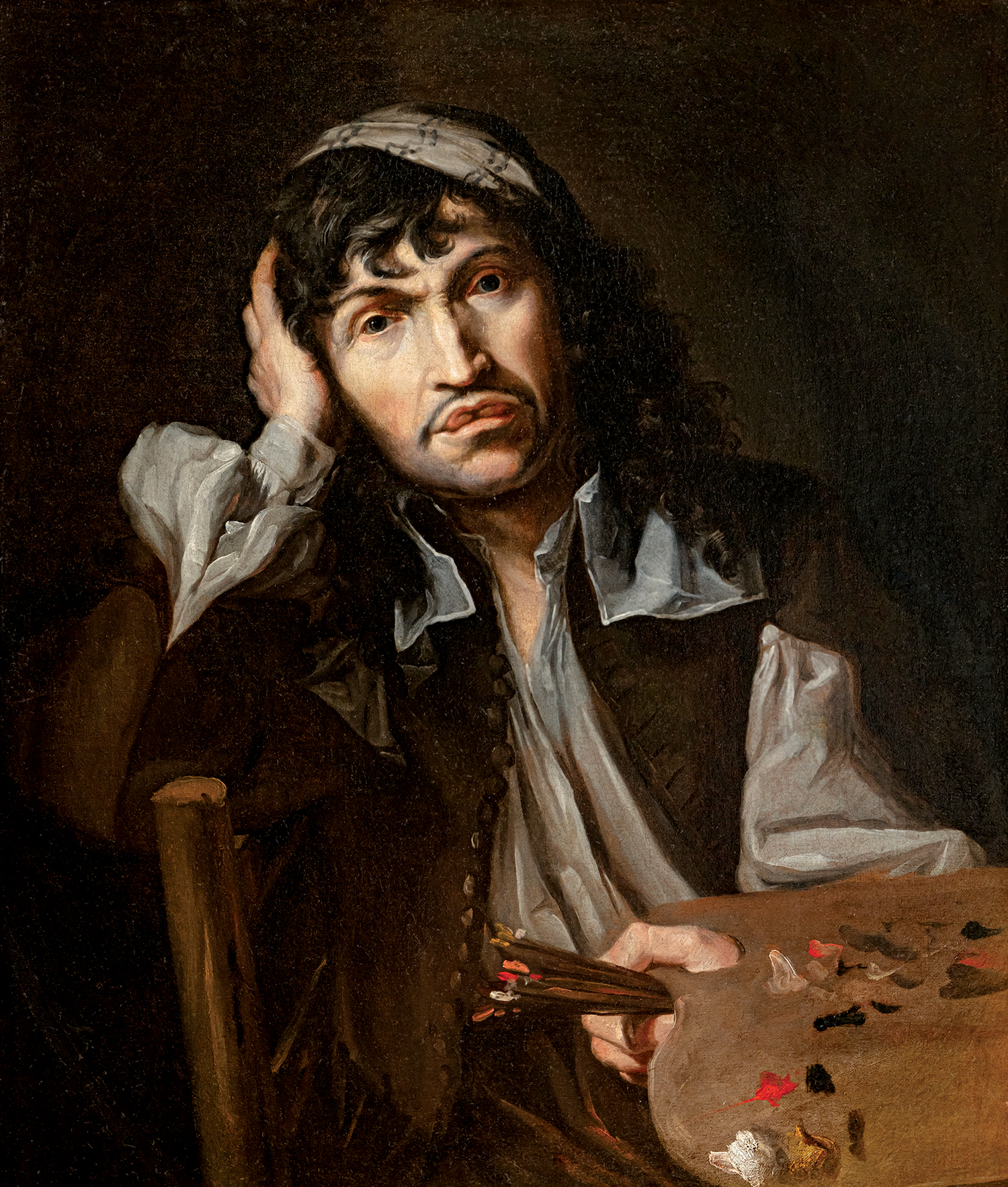 Ce portrait représente un artiste, son instrument de travail à la main, le regard fixe en direction du spectateur. L’attention des peintres pour les portraits d’artistes au cours du XVIIe siècle, s’inscrit dans une quête plus générale d’une peinture fidèle et attentive à la vérité des choses qui connait son apogée dans la Rome d’après Caravaggio. Au XVIIe siècle, Rome est le cœur battant de la création artistique européenne. Des peintres venus de toute l’Italie, de France, d’Espagne et des Flandres s’y installent pour étudier l’Antique, rencontrer des mécènes et affirmer leur talent. Dans ce contexte, le portrait d’artiste devient un moyen d’expression de la personnalité, du statut social et du rôle intellectuel de l’artiste. L’artiste n’est plus un simple artisan, mais un homme d’esprit comparable au poète ou au savant. L’Autoportrait du Cavaliere d’Arpino (vers 1600, Galleria degli Uffizi, Florence) montre le peintre dans une posture noble et fière, vêtu à la mode des gentilshommes, regard assuré : l’artiste revendique son rang dans la société. Ce type de représentation s’oppose aux portraits d’artisans du XVIe siècle, plus modestes, comme ceux des ateliers florentins. Au début du siècle, le Caravage bouleverse la peinture romaine par son réalisme cru et son usage dramatique de la lumière. Dans son David tenant la tête de Goliath (vers 1609-1610, Galleria Borghese, Rome), le visage de Goliath est un autoportrait du Caravage lui-même. À l’inverse, les artistes classiques de l’école de Bologne, tels que Guido Reni ou Domenichino, préfèrent une idéalisation élégante. L’Autoportrait de Guido Reni (vers 1630, Uffizi) présente un visage doux, serein, presque intemporel : l’artiste est une figure d’harmonie et de grâce, non un individu tourmenté. Ces deux tendances – le réalisme introspectif du Caravage et l’idéalisme classique de Reni – illustrent bien la diversité du portrait d’artiste à Rome. Notre tableau s’inscrit dans cette tendance : le modèle, qui ne renie pas ses origines (la pauvreté de son couvre-chef, la simplicité de sa chemise), il devient créateur inspiré et figure intellectuelle.