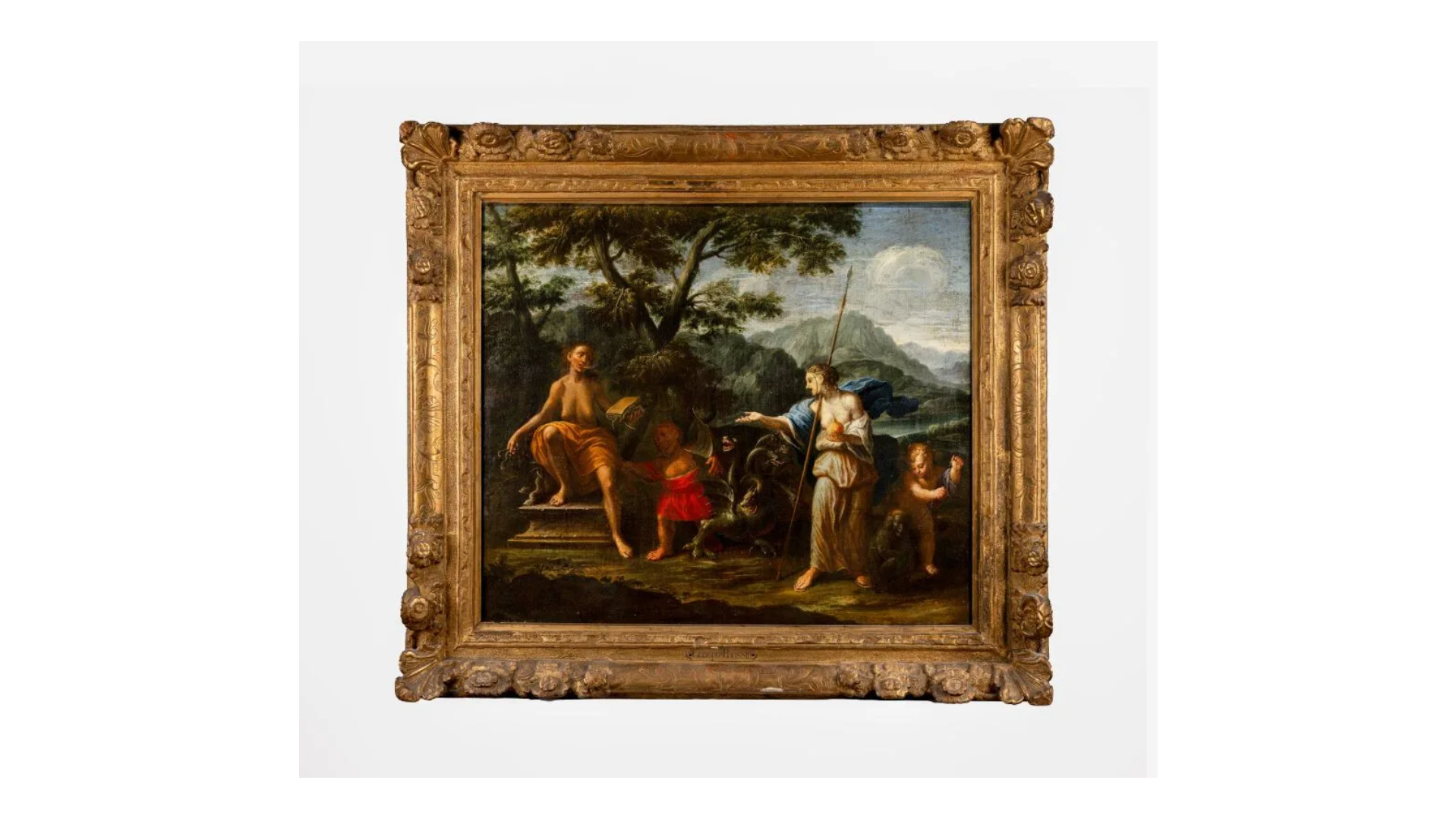 La composition de notre tableau est riche en messages allégoriques. Au centre, la personnification de la Vérité sous les traits d’une jeune femme masquée tenant une grenade, qui se dirige vers le Mensonge assis, sous les traits d’une vieille femme aux seins nus tenant des serpent d’une main et un livre fermé de l’autre. Au centre un nain aux traits grotesques s’accompagne d’une Hydre crachant du feu, souvent associée aux injures ou aux médisances. A droite, un putto conduit un singe enchainé, symbole du péché.