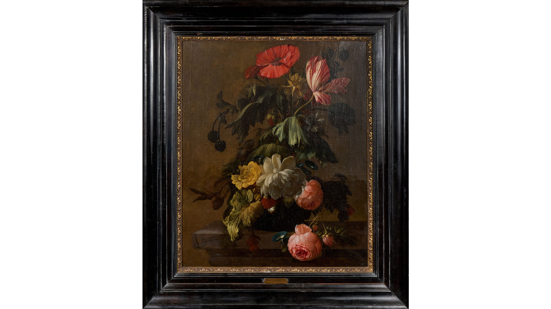 L’œuvre de van den Broeck se caractérise par la finesse et le réalisme de ses fleurs, souvent disposées dans des niches ou des compositions soigneusement équilibrées. Ses tableaux se distinguent par la richesse des couleurs et l’attention portée aux détails. Plusieurs variantes signées de cette composition par l’artiste sont connues : une conservée à Copenhague (Staten Museum for Kunst) ; une deuxième passée en vente chez Christie’s à Amsterdam (23 juin 2015, n° 43, reproduit) et une autre proposée chez Dreweatts à Newbury (14 décembre 2022, n° 67, reproduit).