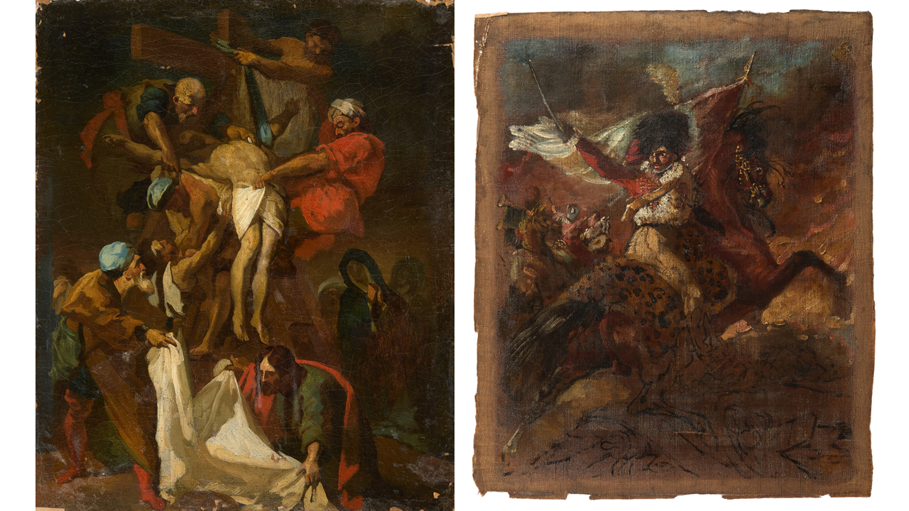 Sur ce portrait Géricault réalise sa version de la Descente de Croix, puis au revers de cette toile, il nous livre son premier travail personnel : un officier de chasseurs, esquissé rapidement, où la vivacité de son pinceau déploie la virtuosité qui le caractérise. L’esquisse est particulièrement intéressante puisqu’elle montre le travail de l’artiste à plusieurs étapes de sa réalisation. Le haut de l’œuvre est composé de cavaliers où le mouvement est insufflé par la touche rapide et rougeoyante de l’arrière-plan qui évoque le chaos de la bataille. La partie inférieure est simplement dessinée au pinceau : les membres du cheval sont indiqués par un simple trait noir. Elle constitue la première idée pour le grand tableau du Louvre, Officier de chasseurs à cheval de la garde impériale chargeant (toile, 292 x 194 cm, voir Ph. Grunchec, Tout l’œuvre peint de Géricault, Paris, 1978, n°48, reproduit).